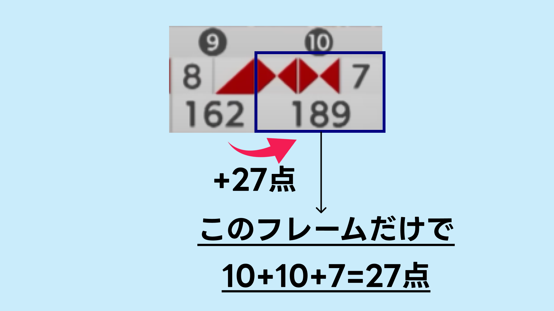 次の2投分の投球が、ボーナスとして加算されるからです。スペアよりも1投分ボーナスが多いですね。.png)