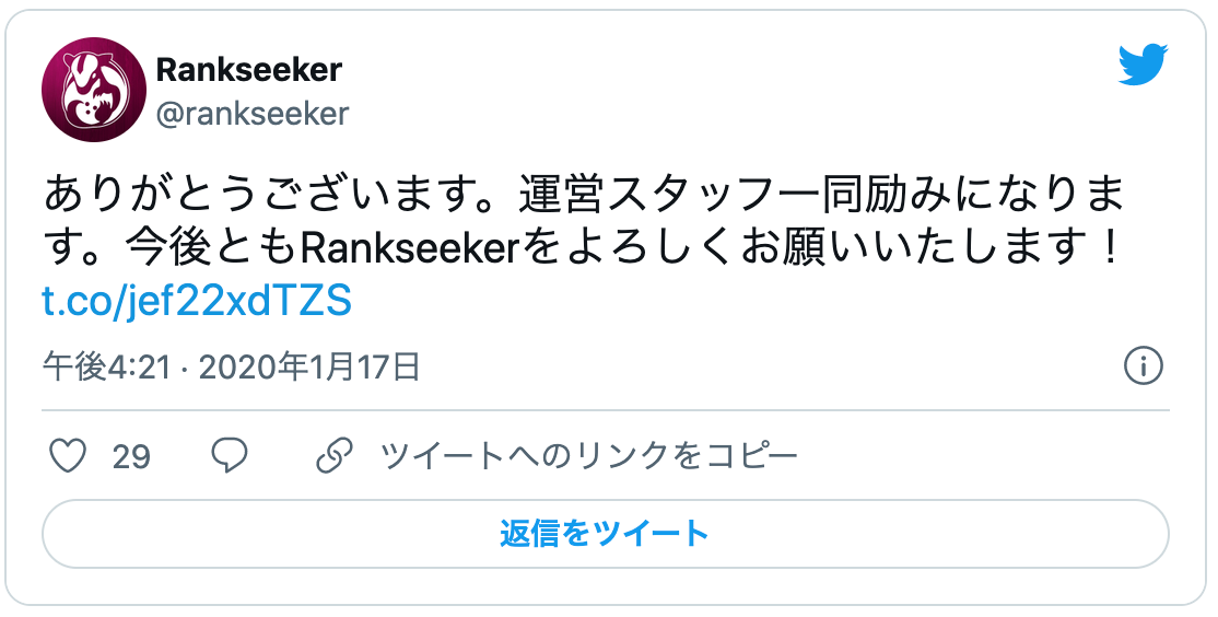 Rankseeker公式ツイッターよりメッセージを届きました。